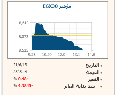 أغلق المؤشر الرئيسى للبورصة EGX30 على تراجع فى ختام تداولات جلسة اليوم الأحد بهبوط 0.48% عند مستوى 8535.2 نقطة رغم المكاسب الصباحية المحققة، وانخفض مؤشر EGX70 للأسهم المتوسطة 0.16% مغلقا عند مستوى 456.4 نقطة، كما تراجع مؤشر EGX100 الأوسع نطاقا بنسبة 0.38% ليستقر عند مستوى 959 نقطة.