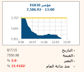 تراجع المؤشر الرئيسى للبورصة EGX30 فى ختام تداولات اليوم الأربعاء بنسبة 2.6% ليهبط إلى مستوى 7550.9 نقطة، وانخفض مؤشر EGX70 للأسهم المتوسطة 1.55% مغلقا عند مستوى 412.6 نقطة، كما هبط مؤشر EGX100 الأوسع نطاقا بنسبة 1.69% ليستقر عند مستوى 873.6 نقطة.