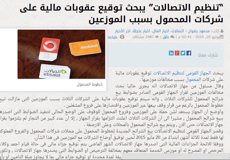 وكانت البورصة نشرت ان الجهاز القومى لتنظيم الاتصالات بحث توقيع عقوبات مالية على شركات المحمول بسبب مخالفات موزعيها .