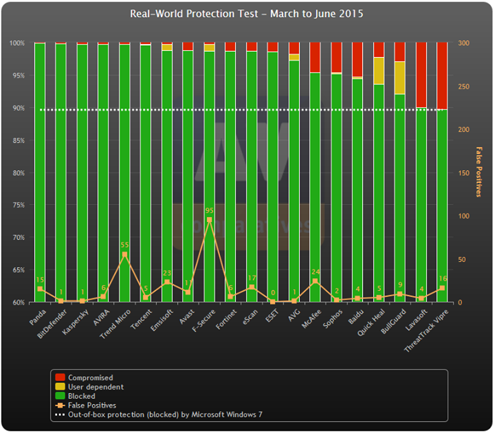 بحسب آخر تقرير تم إصداره في يونيو 2015 من مؤسسة “AV-Comparatives” المستقلة ومقرها النمسا، عقد مقارنة بين كل منتجات “صد البرمجيات الخبيثة وتحقيق الأمان للحواسيب” الموجودة في السوق في الوقت الحالي، ويأتي التقرير بعد مجموعة اختبارات أجرتها معاملها لقياس كل عنصر من عناصر الأمن التي يوفرها كل مُنتَج حتى يُظهِر التقرير قدرة كل منتج منها في التصدي للهجمات وإزالة أضرارها بالكامل.
