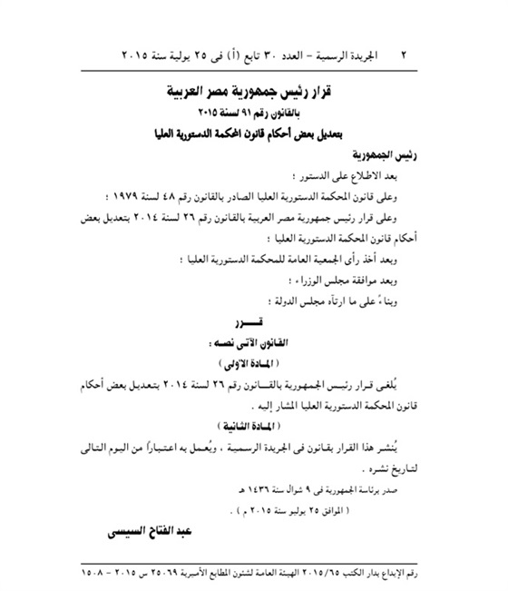 نشرت الجريدة الرسمية في عددها الصادر، الثلاثاء، قرار الرئيس عبد الفتاح السيسي بالقانون رقم 91 لسنة 2015، بإلغاء قرار رئيس الجمهورية السابق المستشار عدلي منصور، بالقانون رقم 26 لسنة 2014 والخاص بتعديل بعض أحكام قانون المحكمة الدستورية العليا, ويعمل بهذا القرار اعتبارا من اليوم التالى لتاريخ نشره.
