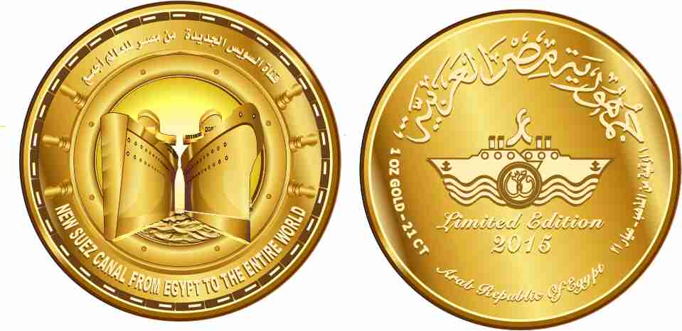 وأشار الوزير الي ان مصلحة سك العملة التابعة لوزارة المالية ستقوم بسك هذا الاصدار التذكاري الذي سيكون علي شكل قطع ذهبية عيار 21 باوزان مختلفة وهي ربع اوقيه ونصف اوقية واوقيتان وثلاث اوقيات و5 اوقيات (الاوقية تساوي 34 جرام) تحمل علي وجهها الاول شعار قناة السويس الجديد بجانب عبارة “قناة السويس الجديدة من مصر للعالم اجمع” وعلي الوجه الاخر تصميم هندسي يظهر سفينتين متقابلتين يعبران القناة علي مجسم للكرة الارضية حيث ترمز حركة السفينتين لازدواج الممر الملاحي للقناة وتاثير ذلك الايجابي علي حركة الملاحة الدولية.
