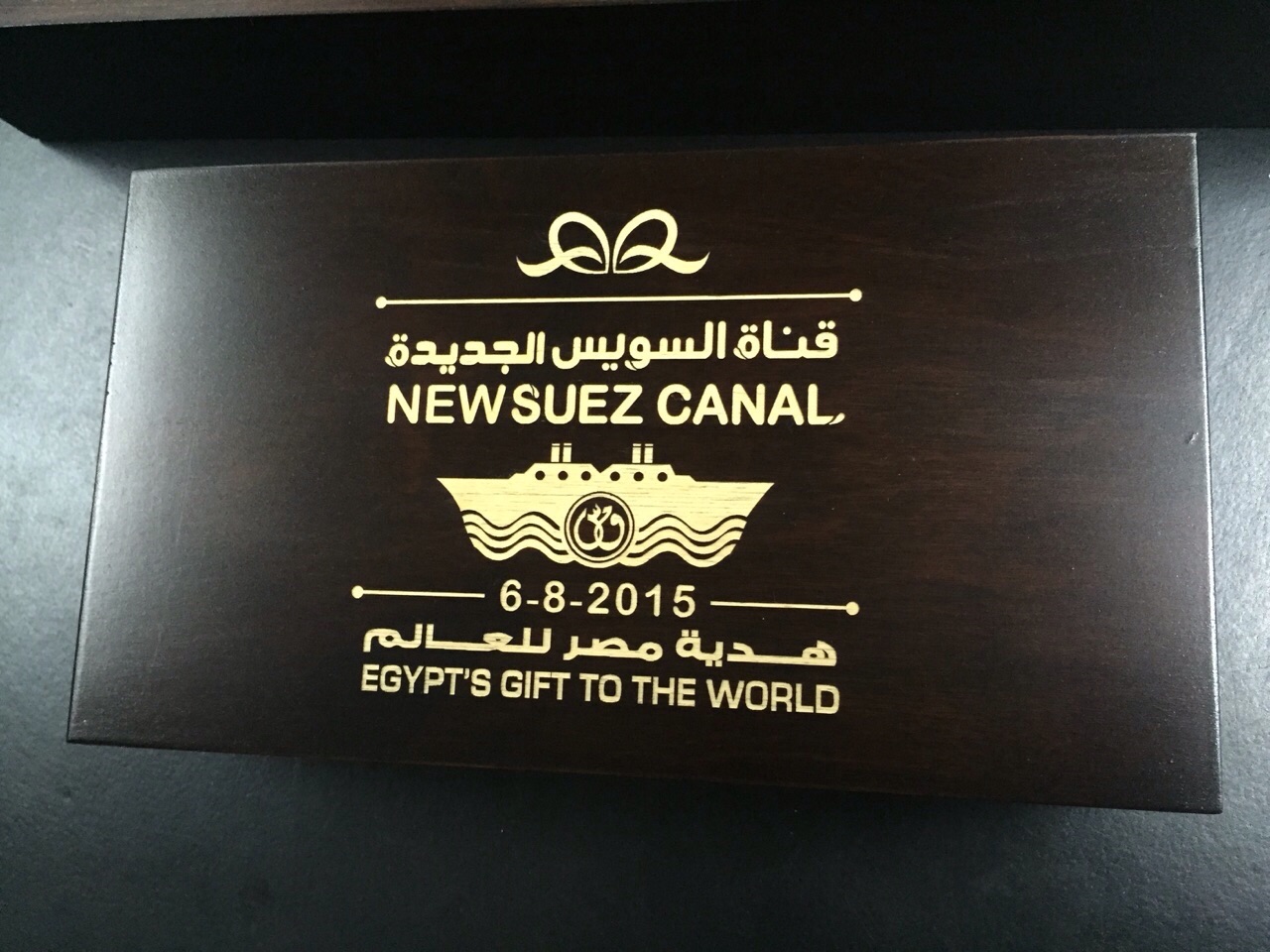 تضم العلب عملة تذكارية تحمل على وجهها الأول شعار قناة السويس الجديدة بجانب عبارة «قناة السويس الجديدة هدية مصر للعالم» وعلى الوجه الآخر تصميم هندسي يظهر سفينتين متقابلتين تعبران القناة على مجسم للكرة الارضية حيث ترمز حركة السفينتين لإزدواج الممر الملاحي للقناة وتأثير ذلك الإيجابي على حركة الملاحة الدولية، وصورة من وثيقة حفر القناة الجديدة موقعة من الرئيس عبد الفتاح السيسي ونبذة عن أهمية المشروع وأثره على الإقتصاد المصري والعالمي.