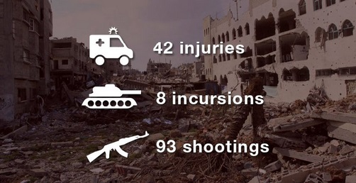 وذكرت صحيفة ميدل ايست مونيتور البريطانية أنه خلال الفترة من يناير إلى يونيو، كان هناك 8 توغلات عسكرية, وعندما دخلت القوات الصهيونية غزة تم الانسحاب, وفى الفترة نفسها كان هناك 93 عملية إطلاق نار في البر والبحر.