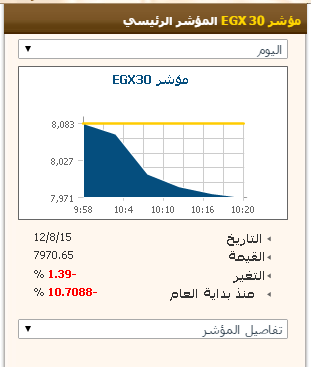 وانخفض مؤشر EGX20 بنسبة 1.62% ليصل إلىى مستوى 7955.4 نقطة، كما تراجع مؤشر EGX70 للأسهم المتوسطة بنسبة 0.91% ليبلغ مستوى 448.34 نقطة، بينما سجل مؤشر EGX100 الأوسع نطاقا أقل نسبة هبوط بلغت 0.73% ليصل إلى مستوى 933.36 نقطة.