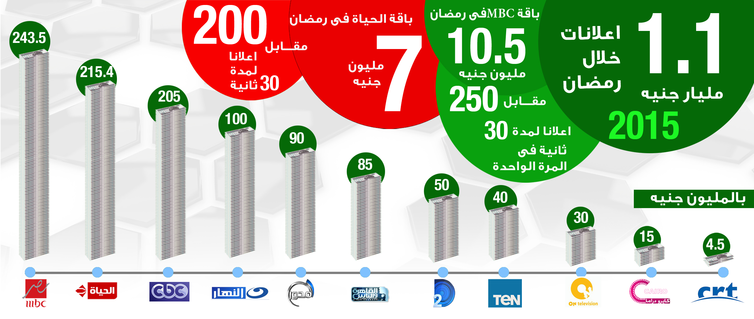 جمعت اكبر الفضائيات فى مصر والبالغ عددها 11 قناة فضائية نحو 1.1 مليار حنيه اعلانات خلال الموسم الرمضانى , ويعد حجم الاعلانات خلال رمضان 2015 الاعلى فى تاريخ الفضائيات على الرغم من الاوضاع الاقتصادية الراهنة .