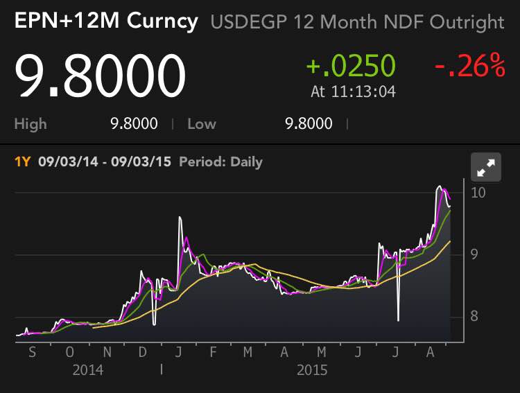 وذكرت وكالة أنباء بلومبيرج فى تقرير لها أن قيمة الجنيه فى العقود الآجلة تراجعت بنسبة 20% لمدة 12شهر، وتم تداول العقود الآجله للجنيه أمس عند 9.775 للدولار وكانت قد وصلت إلى 10.125 يوم 24 أغسطس، وهو أدنى توقع منذ أن بدأت وكالة بلومبيرج في تتبع البيانات عام 2007، وتم تداول الأسهم الأجنبية المدرجة في البلاد بأقل من الأسعار المحلية بنسبة 12%.