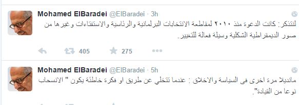 أكد الدكتور محمد البرادعي نائب رئيس الجمهورية الأسبق ، أن الدعوة إلى مقاطعة الإنتخابات البرلمانية وسيلة فعالة للتغيير ، جاء ذلك عبر تغريده له على تويتر قائلاً “الدعوة منذ ٢٠١٠ لمقاطعة الانتخابات البرلمانية والرئاسية والاستفتاءات وغيرها من صور الديمقراطية الشكلية وسيلة فعالة للتغيير” ..