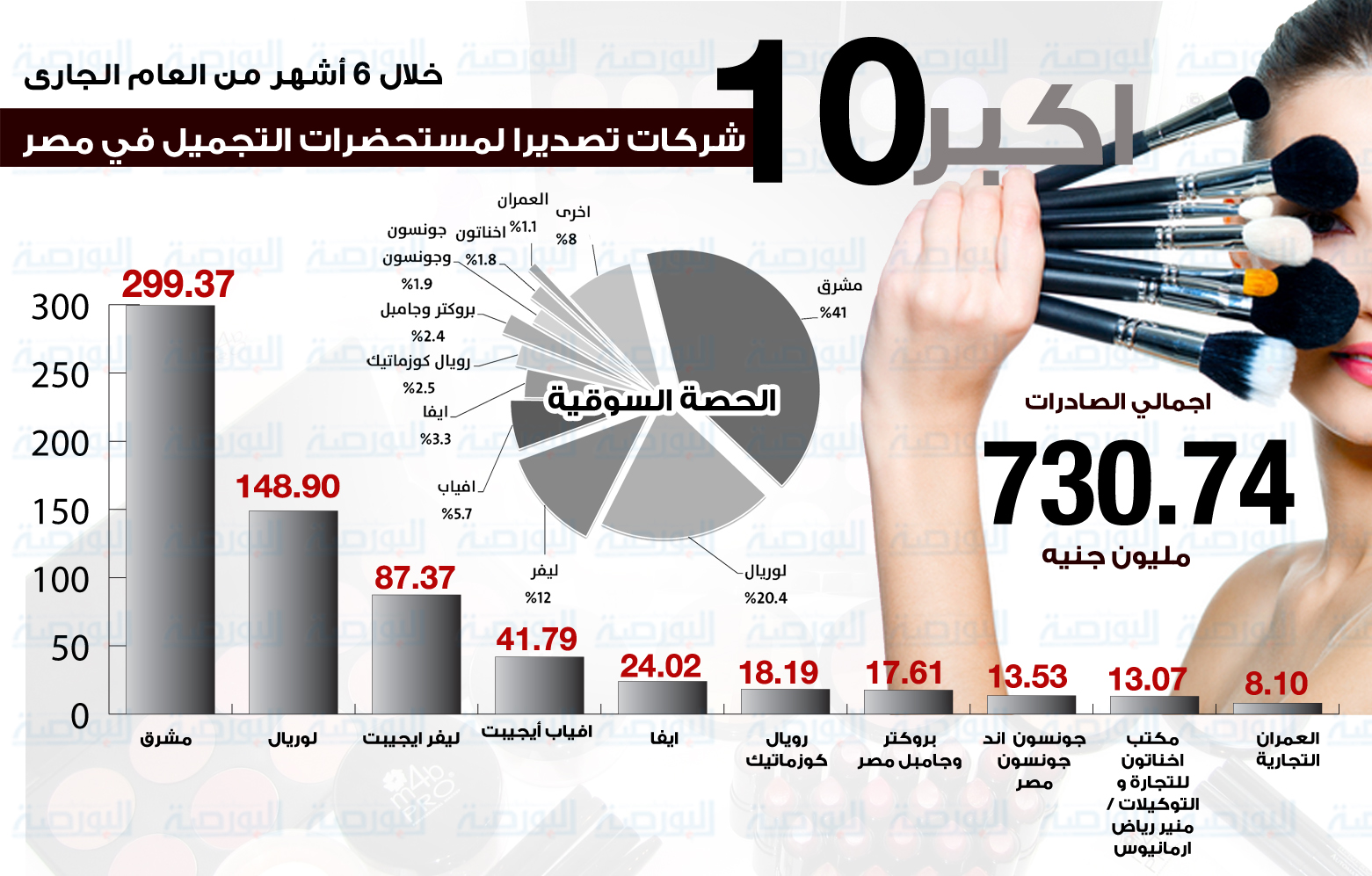 تحتل شركة المشرق المركز الاول فى تصدير مستحضرات التجميل وتليها لوريال و ليفر ايجيبت . [caption id="attachment_774901" align="aligncenter" width="768"]<a href="http://www.alborsanews.com/beta/wp-content/uploads/2015/11/انفوجرافيك-اكبر-10-شركات-تصديرا-لمستحضرات-التجميل-في-مصر.jpg"><img class=" wp-image-774901" src="http://www.alborsanews.com/beta/wp-content/uploads/2015/11/انفوجرافيك-اكبر-10-شركات-تصديرا-لمستحضرات-التجميل-في-مصر-1024x654.jpg" alt="انفوجرافيك اكبر 10 شركات تصديرا لمستحضرات التجميل في مصر" width="768" height="491" /></a> انفوجرافيك اكبر 10 شركات تصديرا لمستحضرات التجميل في مصر[/caption] انفوجرافيك : اكبر 10 شركات تصديرا لمستحضرات التجميل في مصر
