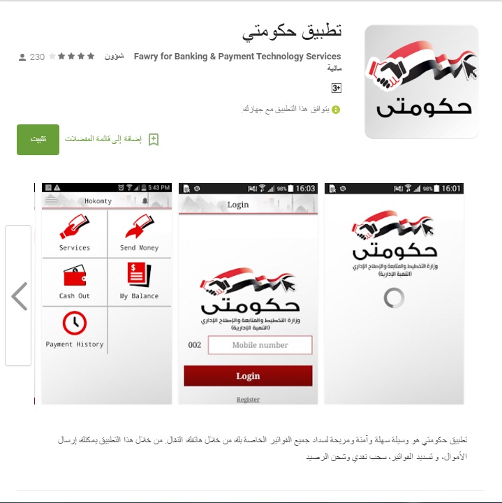 وكانت الحكومة قامت بإطلاق تطبيق حكومتى خلال معرض كايرو اى س تى، ويتيح تقديم عدد من الخدمات عبر اجهزة الهاتف المحمول وتشتمل على خدمات سداد فواتير المياه والكهرباء ورخص المرور بالقاهرة والجيزة.