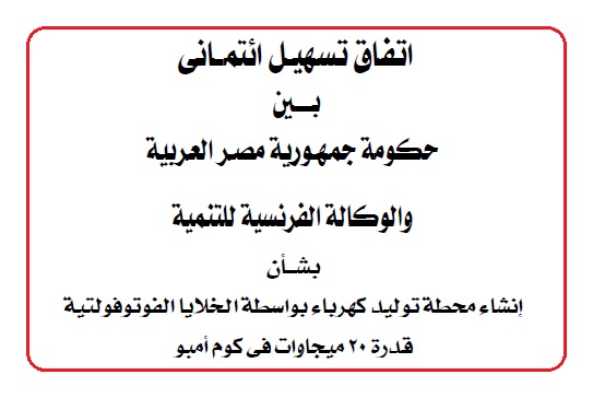 ويتعلق الإتفاق بإنشاء محطة توليد كهرباء بواسطة الخلايا الفوتوفولتية قدرة 20 ميجاوات فى كوم أمبو بمبلغ 40 مليون يورو , والموقع بالقاهرة بتاريخ 16 يوليو عام 2015 , وذلك مع التحفظ بشرط التصديق