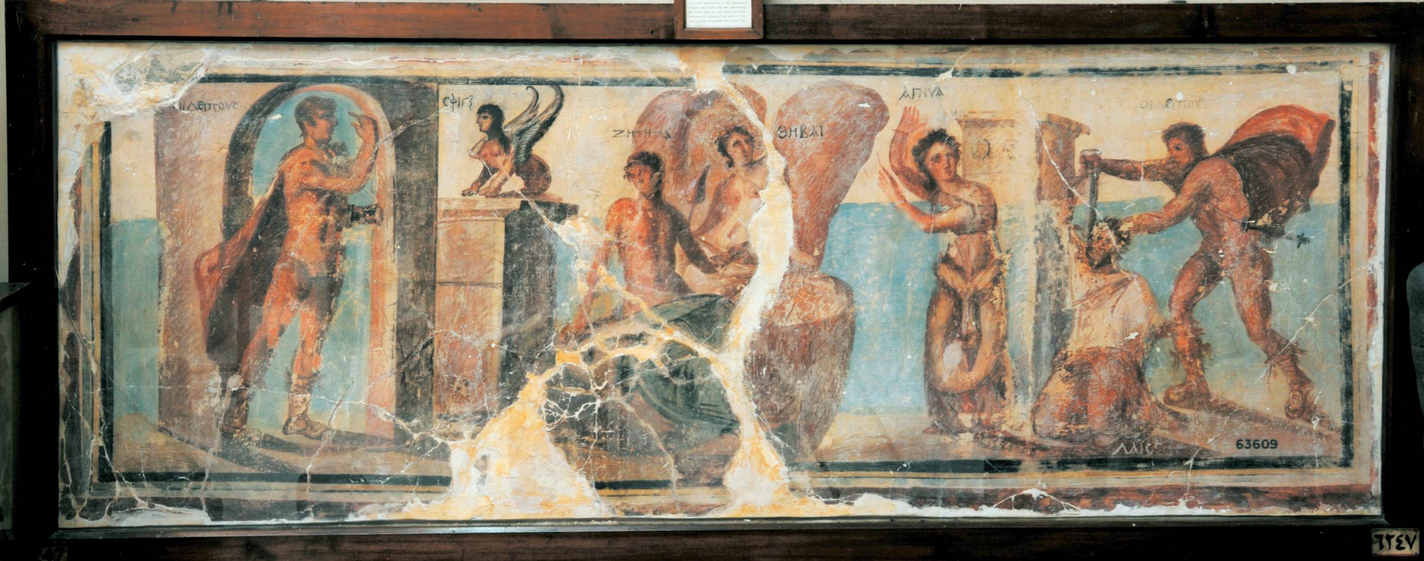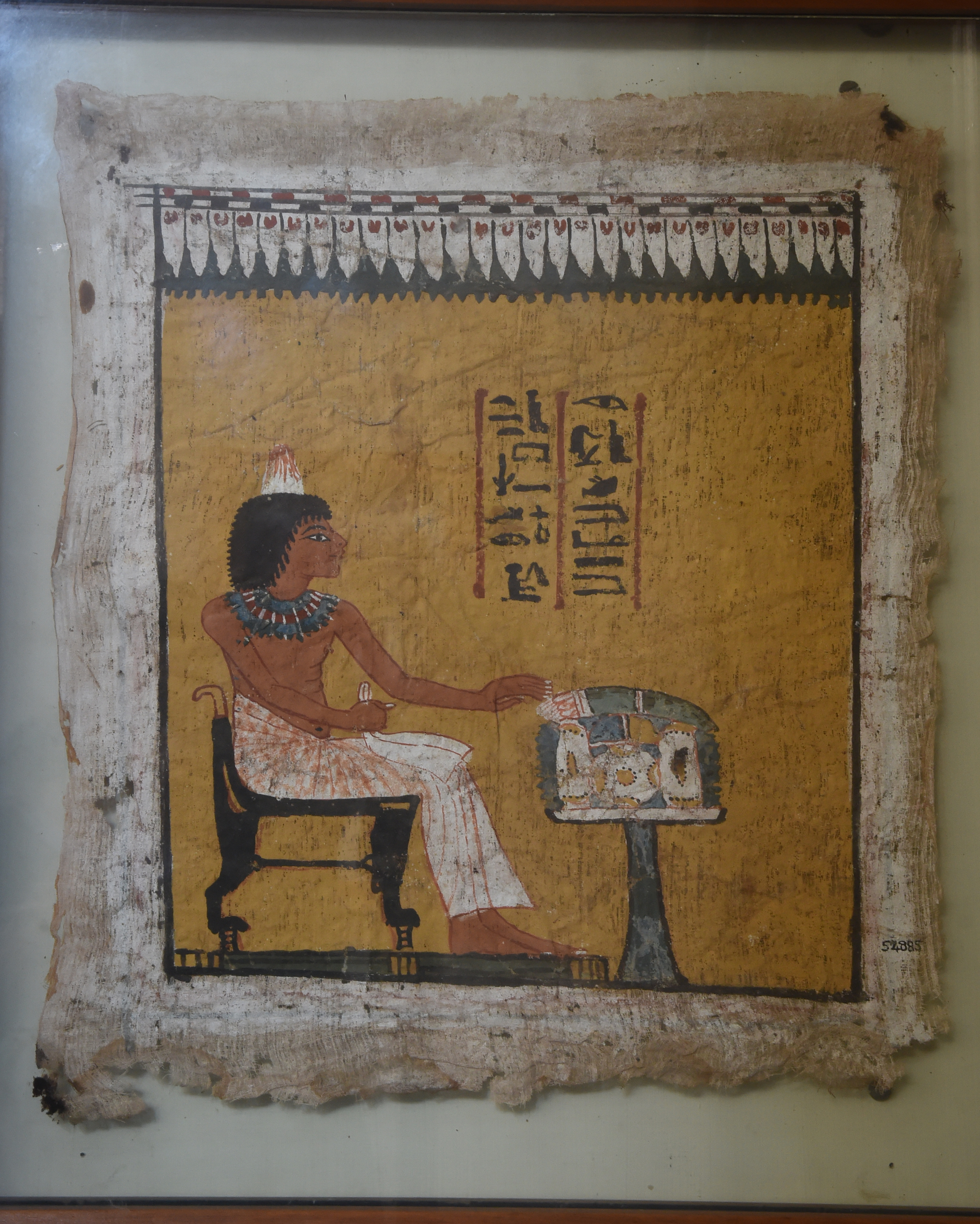 وتمثل اللوحة أسطورة أوديب لشاعر الترجيديا اليوناينة «سوفوليكس»، أما القطعتان الثانية والثالثة، فهما عبارة عن تمثال لحاملة قرابين عثر عليه بمقبرة «مكت رع» من الأسرة الحادية عشرة وقطعة نسيج ملونة لـ«سن نفر» تمثله أمام مائدة القرابين كانت تغطى مومياؤه بمقبرته فى دير المدينة.