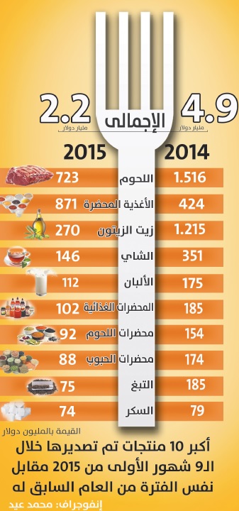 كما تراجعت أيضاً الواردات من الدول العربية بشكل عام بنسبة %56، لتنخفض إلى 1.122 مليار جنيه، مقابل 2.001 مليار جنيه فى الفترة المقارنة العام قبل السابق عليه.