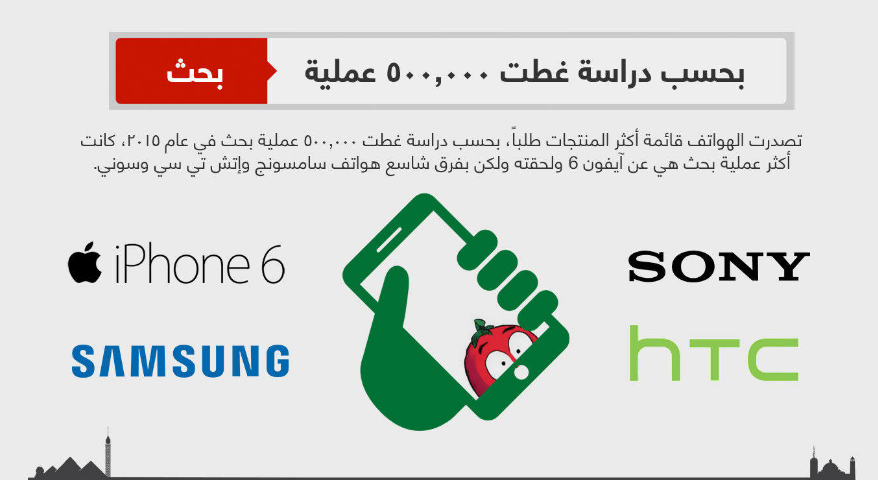 وبحسب الدراسة التى غطت 500 الف عملية بحث، فإن الهواتف الذكية تصدرت المنتجات الأكثر طلبا عبر الانترنت لعام 2015، وتصدر الايفون القائمة، بينما لحق به هواتف سامسونج وإتش تى سى وتذيلت القائمة هواتف سونى.