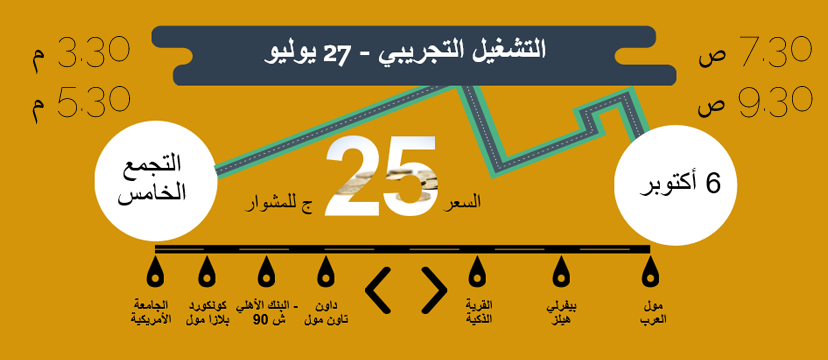 والخدمة متاحة حاليا من خلال خط واحد بين مدينة 6 أكتوبر والتجمع الخامس، وتشمل 6 محطات، هى مول العرب، وبيفرلى هيلز، والقرية الذكية، وداون تاون مول، والبنك الأهلى شارع الـ90، وكونكورد بلازا مول، والجامعة الأمريكية.
