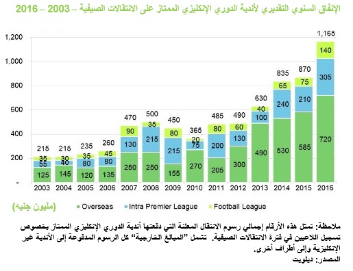 - بلغ صافي إنفاق أندية الدوري الانكليزي الممتاز على الانتقالات الصيفية 685 مليون جنيه في صيف 2016، ويمثل هذا المبلغ صافي التدفقات النقدية الخارجة إلى الأندية الأجنبية والبالغة 630 مليون جنيه وإلى أندية بطولة الدوري الإنكليزي والبالغة 55 مليون جنيه متخطية بذلك مبلغ 460 مليون جنيه الذي سجلته على الانتقالات في صيف 2015؛