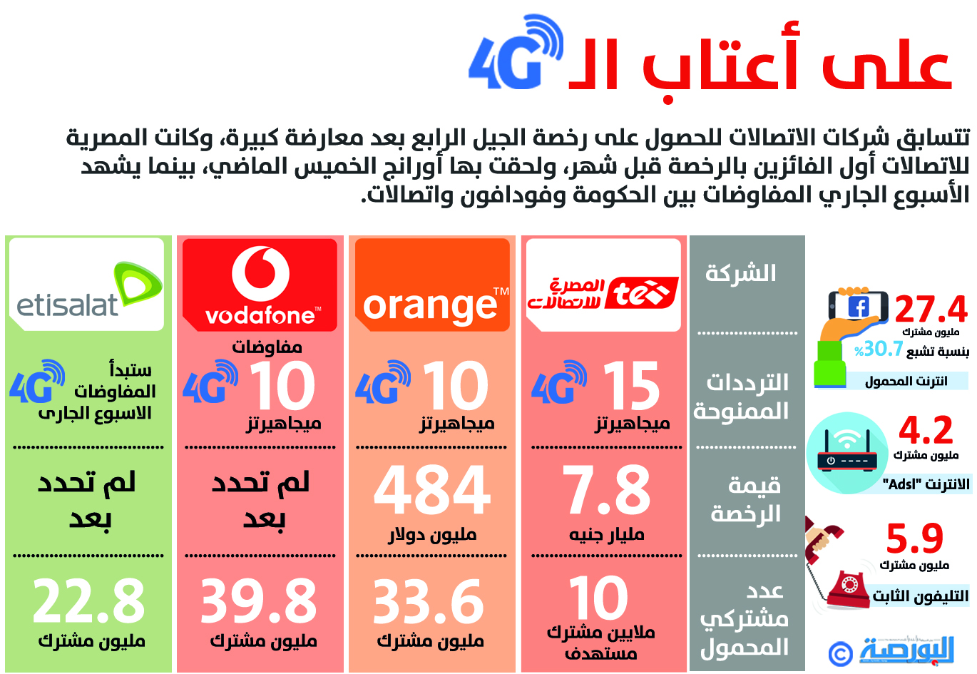 تتسابق شركات الاتصالات للحصول على رخصة الجيل الرابع ” 4G “بعد معارضة كبيرة، وكانت المصرية للاتصالات أول الفائزين بالرخصة قبل شهر، ولحقت بها أورانج الخميس الماضي، بينما يشهد الأسبوع الجاري المفاوضات بين الحكومة وفودافون واتصالات.