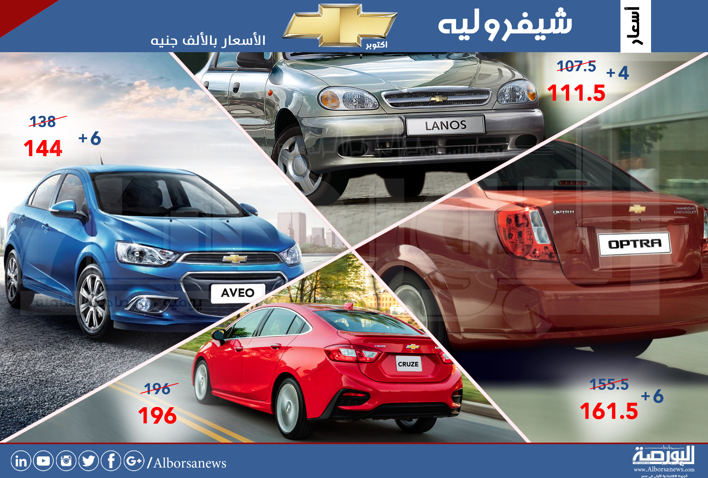ولم تشهد السيارة «كروز» أى تغير فى الأسعار الرسمية واستقرت عند 196 ألف جنيه، بينما زادت السيارة أوبترا، وأفيو 6 آلاف جنيه لكل منهما لتصل أوبترا إلى 161.5 ألف جنيه، بينما الأخيرة 144 ألف جنيه، وارتفع السعر الرسمى للسيارة لانوس 4 الاف جنيه فقط لتصل إلى 111.5 جنيه.