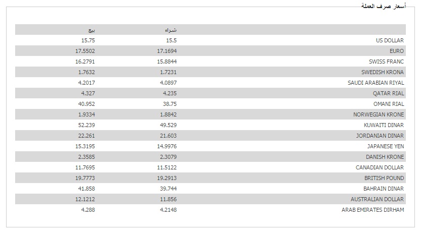 وبلغ سعر صرف اليورو أمام الجنيه 17.16 جنيه للشراء و 17.55 جنيه للبيع، والأسترليني 19.29 جنيه للشراء و 19.77 جنيه للبيع.