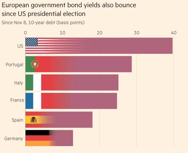 كما ارتفعت عوائد سندات الخزانة بسبب قلق المستثمرين بشأن التخفيضات الضريبية التى يطرحها ترامب، وخطط الإنفاق التى سوف تتسبب فى زيادة التضخم.
