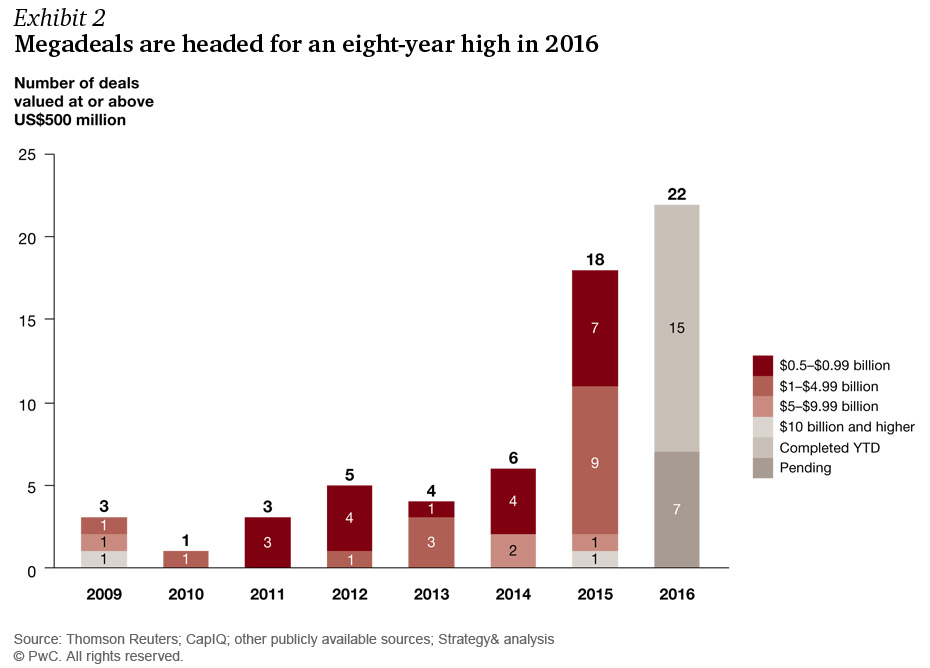 ومن العلامات البارزة فى سوق 2016، ارتفاع عدد الصفقات التى تبلغ قيمتها 500 مليون أو أكثر، بما يوازى 5 أضعاف عام 2013 لتصل إلى 22 صفقة.