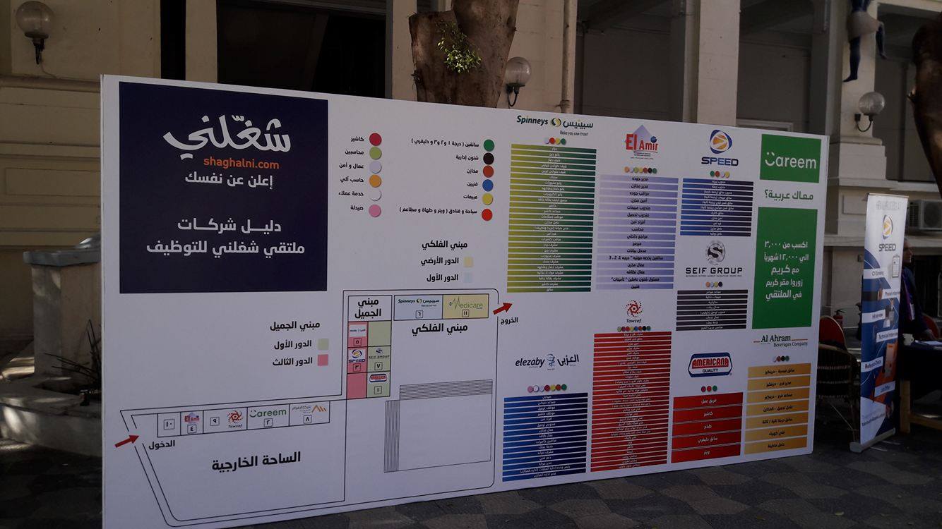 يذكر أن موقع «شغلنى» للتوظيف أون لاين أطلق اليوم ملتقى توظيفيا بالجريك كامبس بوسط البلد شارك به 10 شركات منها مجموعة صيدليات العزبى وشركة سبيد ودرينكز وسيف جروب بالإضافة إلى سبينس، حيث يستطيع الباحثون عن عمل تقدم السيرة الذاتية لهم وإجراء مقابلات شخصية مع مديرى الأقسام بكل شركة، كما تم توفير استوديو للتصوير الفوتغرافى للتصوير الفورى بسعر بلغ 35 جنيها.