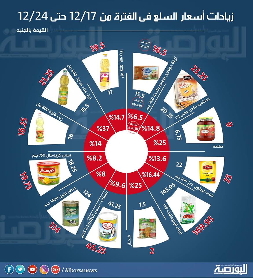 ينشر “البورصة نيوز” إنفوجراف يوضح بالأرقام الزيادات الأخيرة في أسعار السلع في الفترة من ١٧ إلى ٢٤ ديسمبر.