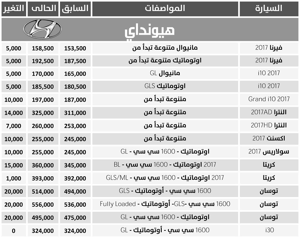 وزادت «هيونداى» سعر «I10» بنحو 5 آلاف جنيه لتبدأ من 170 ألف جنيه، و10 آلاف جنيه زيادة على أسعار «جراند I10» لتبدأ من 197 ألف جنيه، و«إلنترا AD» بنحو 14 ألف جنيه لتبدأ من 325 ألف جنيه، و«إلنترا HD» بنحو 7 آلاف جنيه لتبدأ من 260 ألف جنيه.