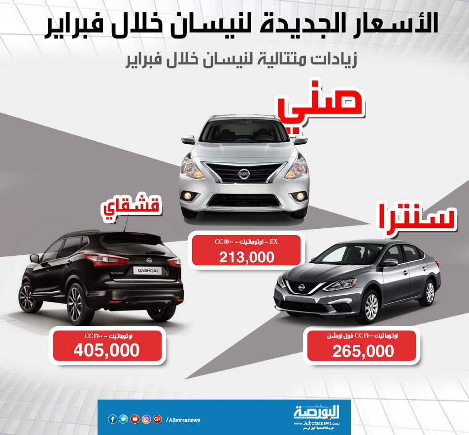 وصل سعر موديل “صني” الفئة الأعلى للعلامة التجارية نيسان إلى 213 ألف جنيه بزيادة 13 ألف جنيه.