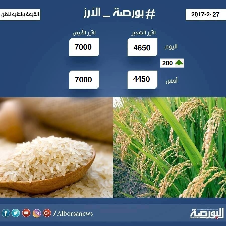 ينشر " البورصة نيوز" اسعار الأرز اليوم الإثنين 27 فبراير مقارنة بأسعار أمس الأحد.