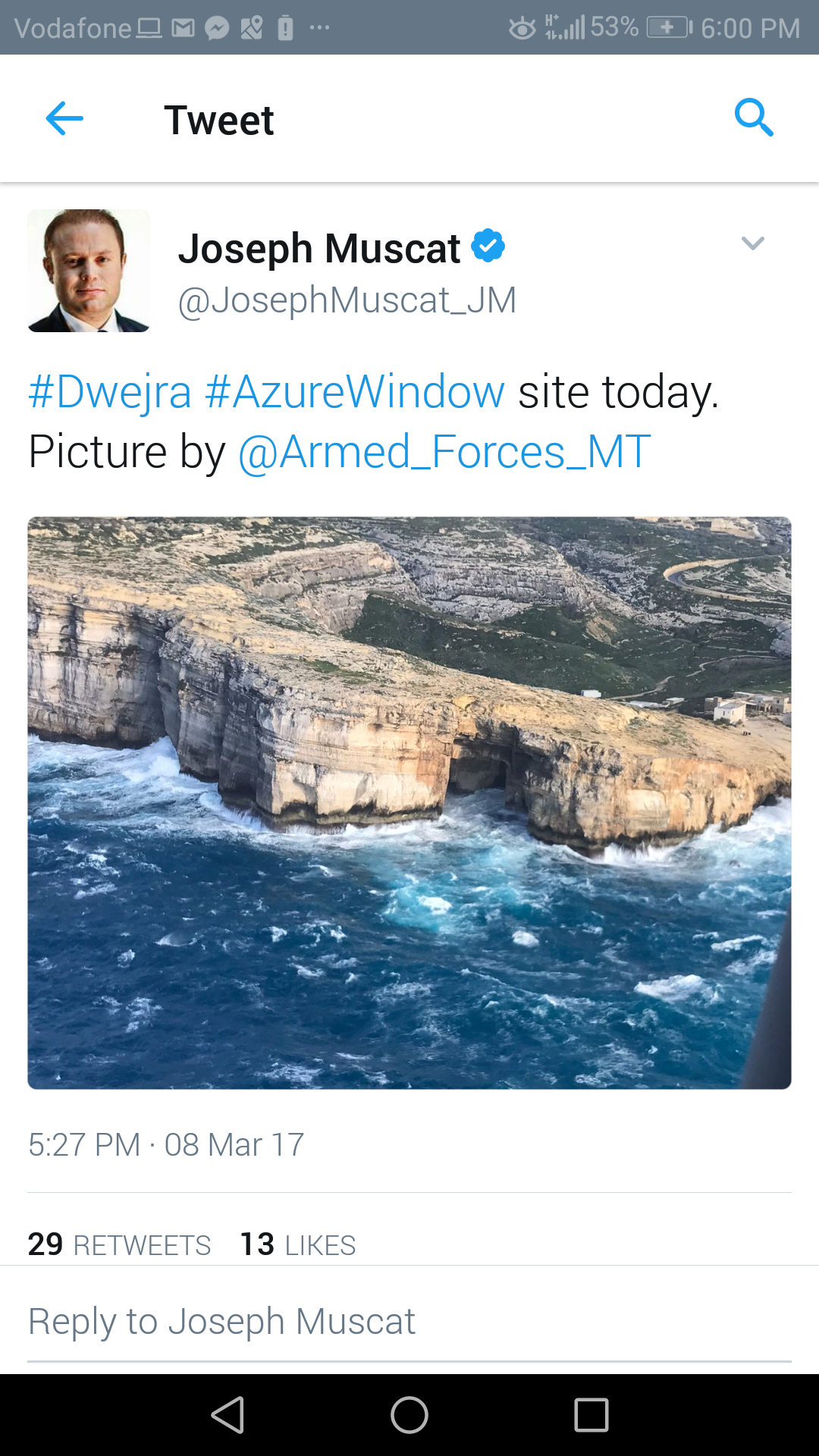 ووصف رئيس الوزراء جوزيف موسكات في تدوينة على حسابه بتويتر حادث انهيار الهيكل الصخري بأنه :” يوم حزين على مالطا”.