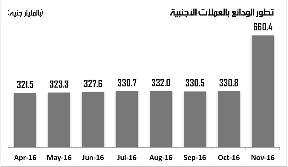 وبلغت الودائع بالعملات الأجنبية فى نوفمبر الماضى 858.3 مليار جنيه مقابل 433.8 مليار جنيه فى أكتوبر.