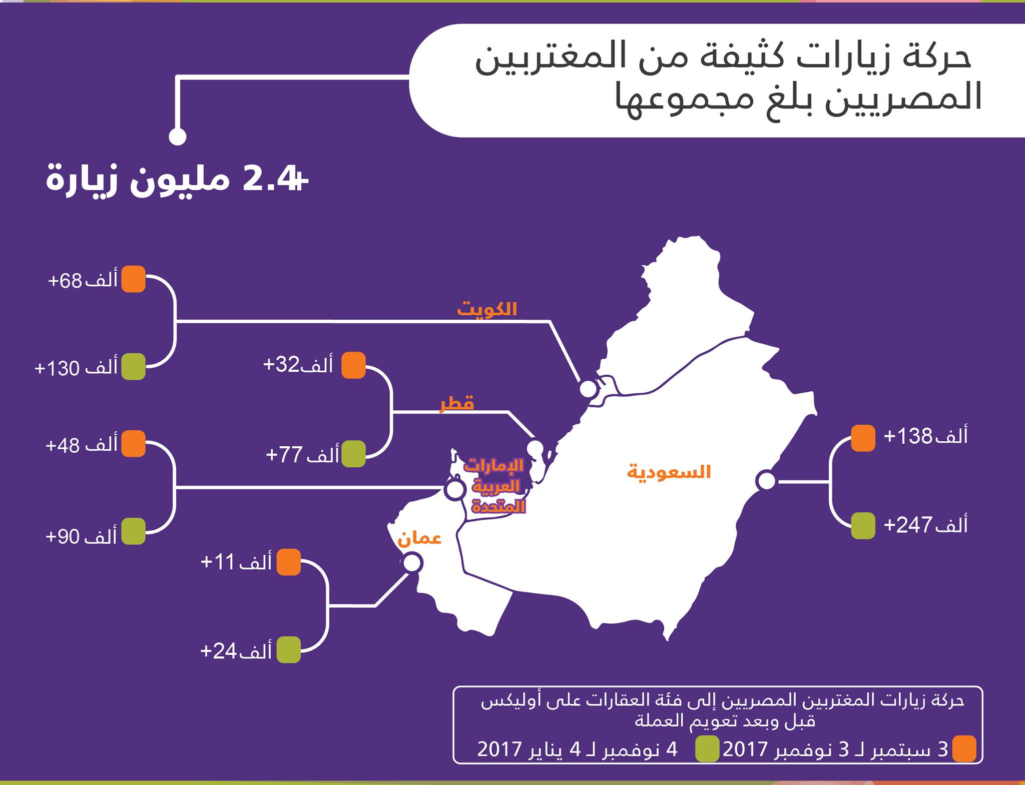 وتُعدّ المملكة العربية السعودية أكبر مساهم، تليها الكويت ثم الإمارات العربية المتحدة ثم قطر، وتتوقع «أوليكس» زيادة فى حركة البحث والطلب على العقارات من المغتربين؛ بسبب تعويم الجنيه.
