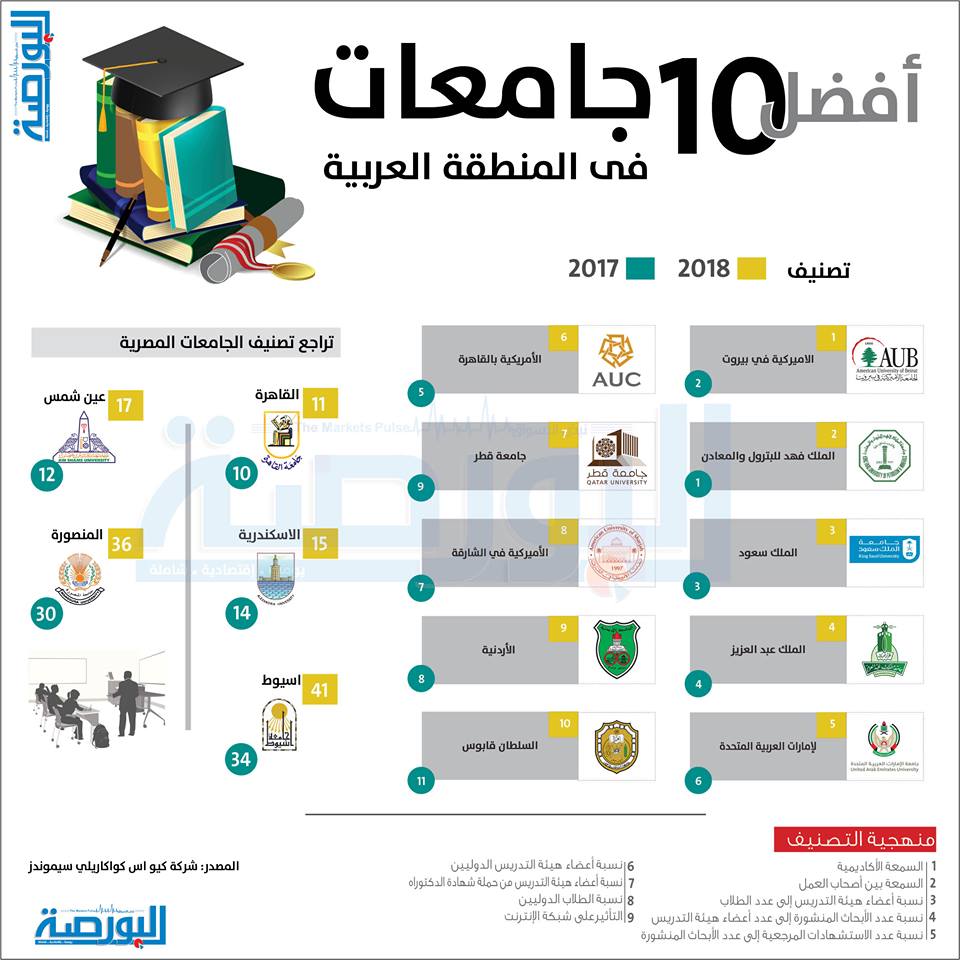 ينشر " البورصة نيوز" انفوجراف يوضح افضل 10 جامعات في المنطقة العربية ومقارنة بين عامي 2017 و 2018