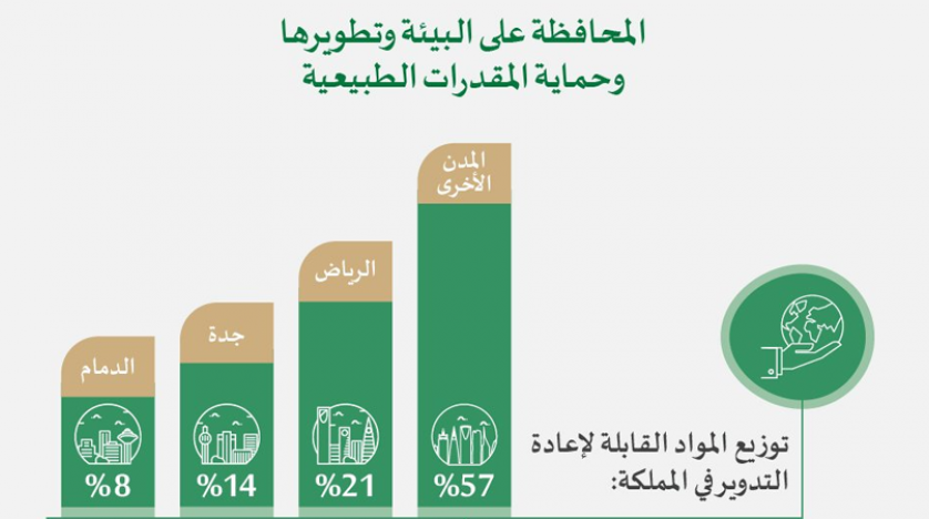 ويتوافر أكثر من 40 % من المواد القابلة لإعادة التدوير في المملكة في 3 مدن رئيسة هي الرياض، جدة، والدمام، وتبلغ كمية المواد القابلة لإعادة التدوير في المملكة سنويا نحو 50 مليون طن، كما يمكن إعادة تدوير والاستفادة مما يصل إلى 85 % منها بغرض الحصول على مصدر للطاقة البديلة ومواد خام تدخل في عمليات التصنيع.