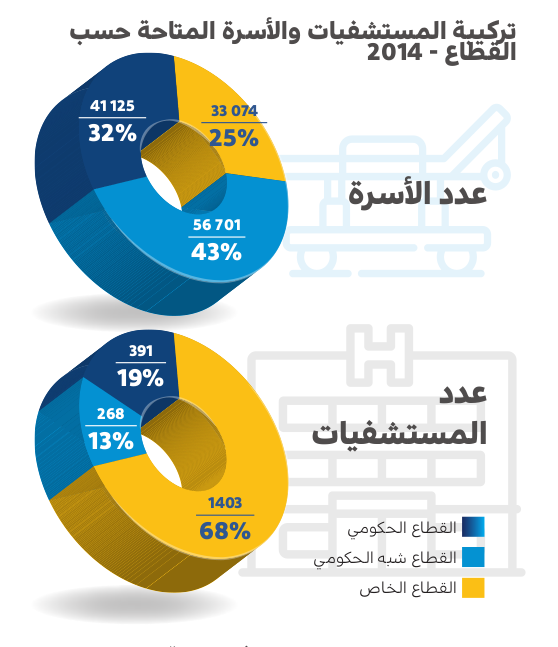 وأوضحت أن متوسط إجمالى عدد الأسرة فى كل مستشفى 105 أسرة للمستشفى فى القطاع الحكومى، و212 سريراً للمستشفى فى القطاع العام أو شبه الحكومى، و24 سريراً للمستشفى فى القطاع الخاص، ويوضح هذا أن إسهام القطاع الخاص بسيط جداً لأنه يهتم بالأطباء بدلاً من الاهتمام بالعلامات التجارية، ويقدم فرص توحيد ودمج واستحواذ.