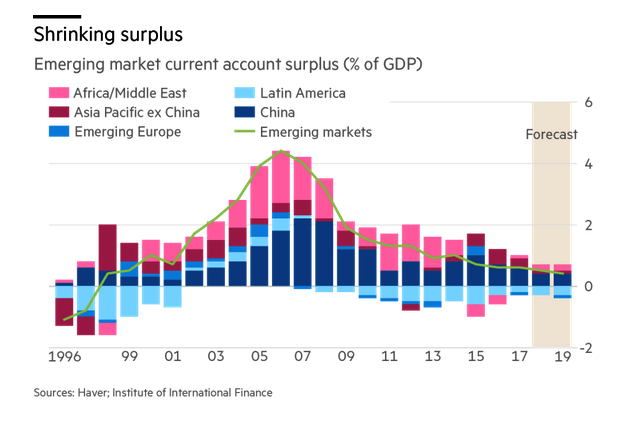 وكشفت بيانات معهد التمويل الدولى، أن الأسواق الناشئة حققت فائضاً فى الحساب الجارى بنسبة 0.6% فقط من الناتج المحلى الإجمالى العام الماضي، لينخفض من ذروة بلغت 4.4% فى عام 2006 ويسجل أدنى مستوياته منذ 1999.