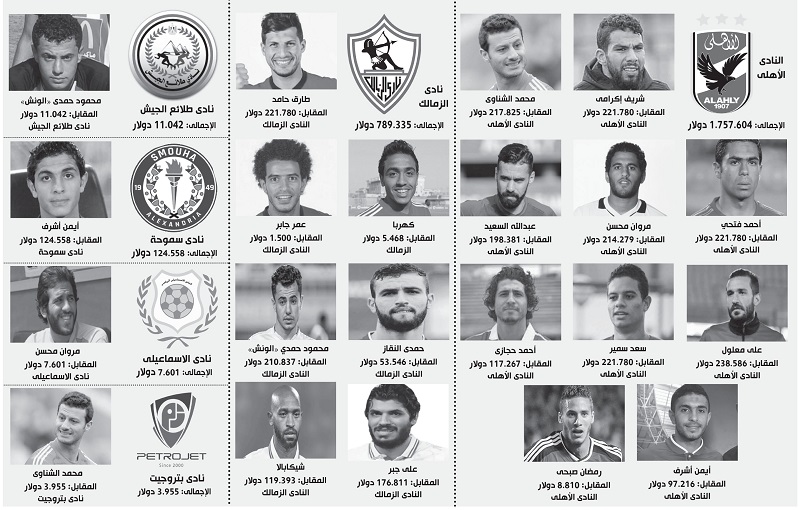 ويحصل النادى على القيمة الكاملة لمشاركة طارق حامد بحوالى 221.8 ألف دولار يليه محمود حمدى «الونش» بقيمة 210.8 ألف دولار، ويذهب المبلغ المتبقى لطلائع الجيش، ثم على جبر 176.8 ألف دولار والذى رحل الشتاء الماضى معاراً لصفوف ويست بروميتش ألبيون الإنجليزى، وشيكابالا 119.4 ألف دولار قبل أن يرحل معاراً لصفوف الرائد السعودى.
