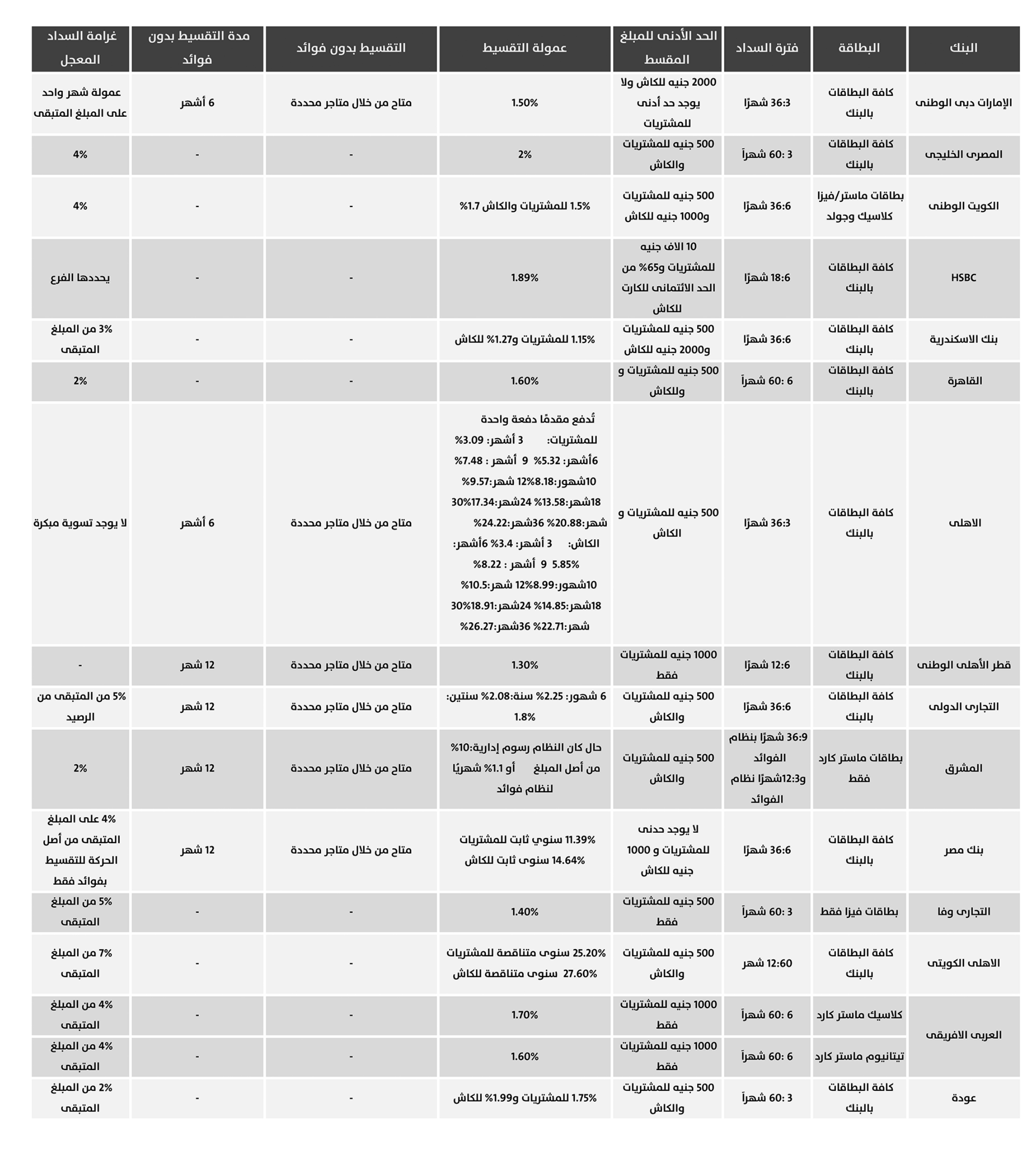 وأظهر مسح أجراه «بنوك وتمويل» تقديم 15 بنكاً خدمة التقسيط عبر الهاتف للمشتريات والسحب النقدى من خلال البطاقات الائتمانية لمدد تتراوح بين 3 و60 شهراً، بمعدلات عائد متباينة تختلف حسب المدة والمبلغ فى بعض البنوك. فى حين أن بنوك الإمارات دبى الوطنى، والأهلى، ومصر، والتجارى الدولى، وقطر الأهلى الوطنى، والمشرق، أتاحت خيار التقسيط دون فوائد لمدد بين 6 أشهر وعام من خلال عدد من المتاجر المتعاقدة معها.