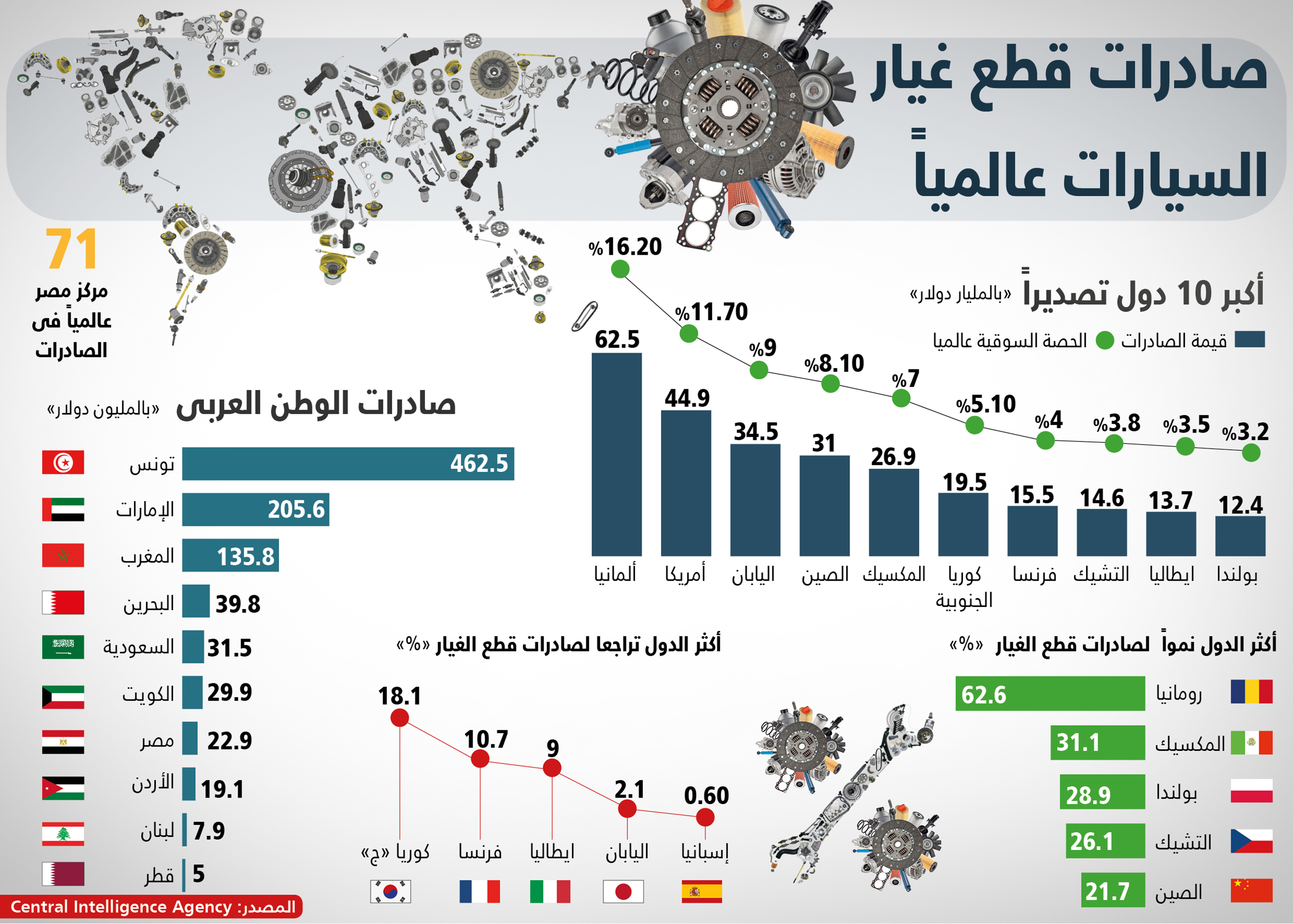 بينما سجلت خمسة بلدان انخفاضاً فى مبيعاتها من قطع غيار السيارات المصدرة، وهى كوريا الجنوبية بنسبة تراجع 18.1% وفرنسا فى المركز الثانى بانخفاض %10.7، وإيطاليا بالمركز الثالث من حيث التراجع بهبوط نسبته %9، وجاءت اليابان وإسبانيا فى المركزين الرابع والخامس بتراجع نسبته %2.1 و%0.6 بالترتيب.