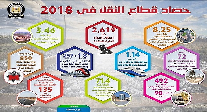 وأشار المركز- فى الانفوجراف الذى نشره على صفحته الرسمية للتواصل الاجتماعي الفيسبوك حول المشروعات التي تم تنفيذها في قطاع النقل، وذلك خلال عام 2018- إلى التعاقد على توريد 6 قطارات، وعدد1300عربة قطارات سكك حديدية بتكلفة 1.14 مليار يورو, فضلاً عن تطوير 72 مزلقان للعمل أوتوماتيكياً لمنع الحوادث الناتجة عن تدخل العامل البشرى ليصبح إجمالي عدد المزلقانات الطورة 930 مزلقان.