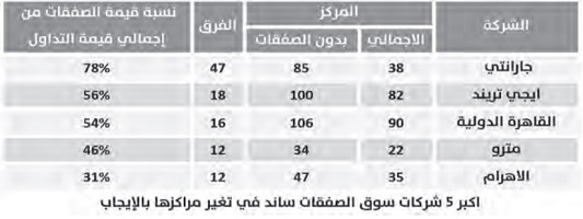 وساهمت الصفقات في تغيرات كبيرة في ترتيب بعض الشركات، حيث استحوذت الصفقات على 46% من تعاملات شركة “مترو لتداول الأوراق المالية” لترفع ترتيب الشركة 12 مركز، بعد تنفيذ صفقات بقيمة 2 مليار جنيه خلال 2018.