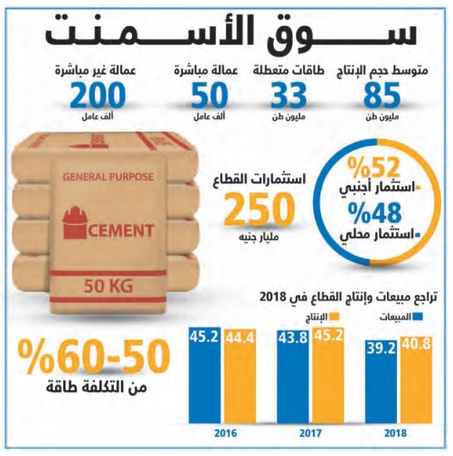 وفقًا لبيانات البنك المركزي، تراجع حجم إنتاج الأسمنت فى الشهور الـ11 الأولى من العام 2018 إلى 40.8 مليون طن، مقابل 45.5 مليون طن في الفترة نفسها من العام 2017، بنسبة هبوط بلغت 10.4%.