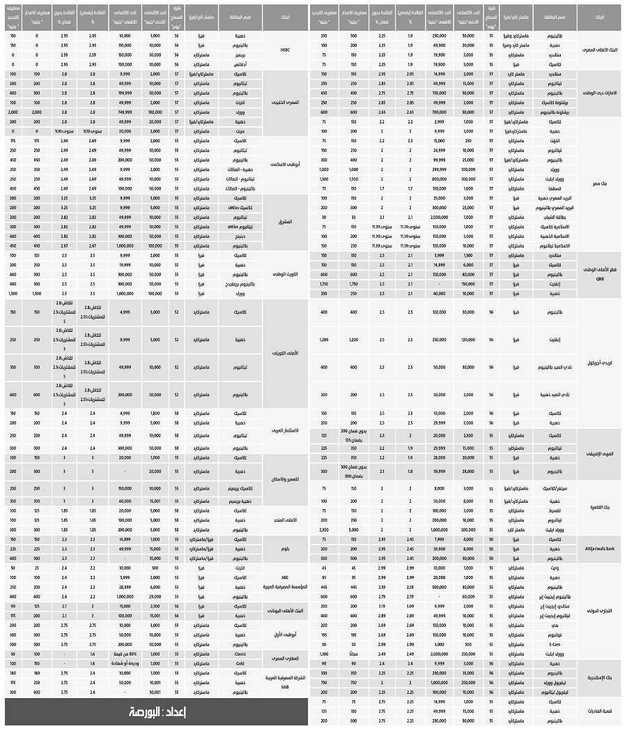 وكذلك تتيح البطاقة الذهبية ببنكى الأهلى المتحد والأهلى اليونانى أعلى حد ائتمانى يصل إلى 100 الف جنيه بعائد يتراوح بين 1.8 و%2.1، فى حين تساوى الحد الائتمانى الأقصى ببنوك الشركة المصرفية والقاهرة والأهلى المصرى وتنمية الصادرات وبنك أبوظبى الأول عند 50 ألف جنيه، وتلتها بنوك التعمير والإسكان والأهلى قطر الوطنى عند 40 ألف جنيه، وتراوحت أسعار الفائدة المضمنة على البطاقات الائتمانية الذهبية بالبنوك بين %1.9 و%2.9.