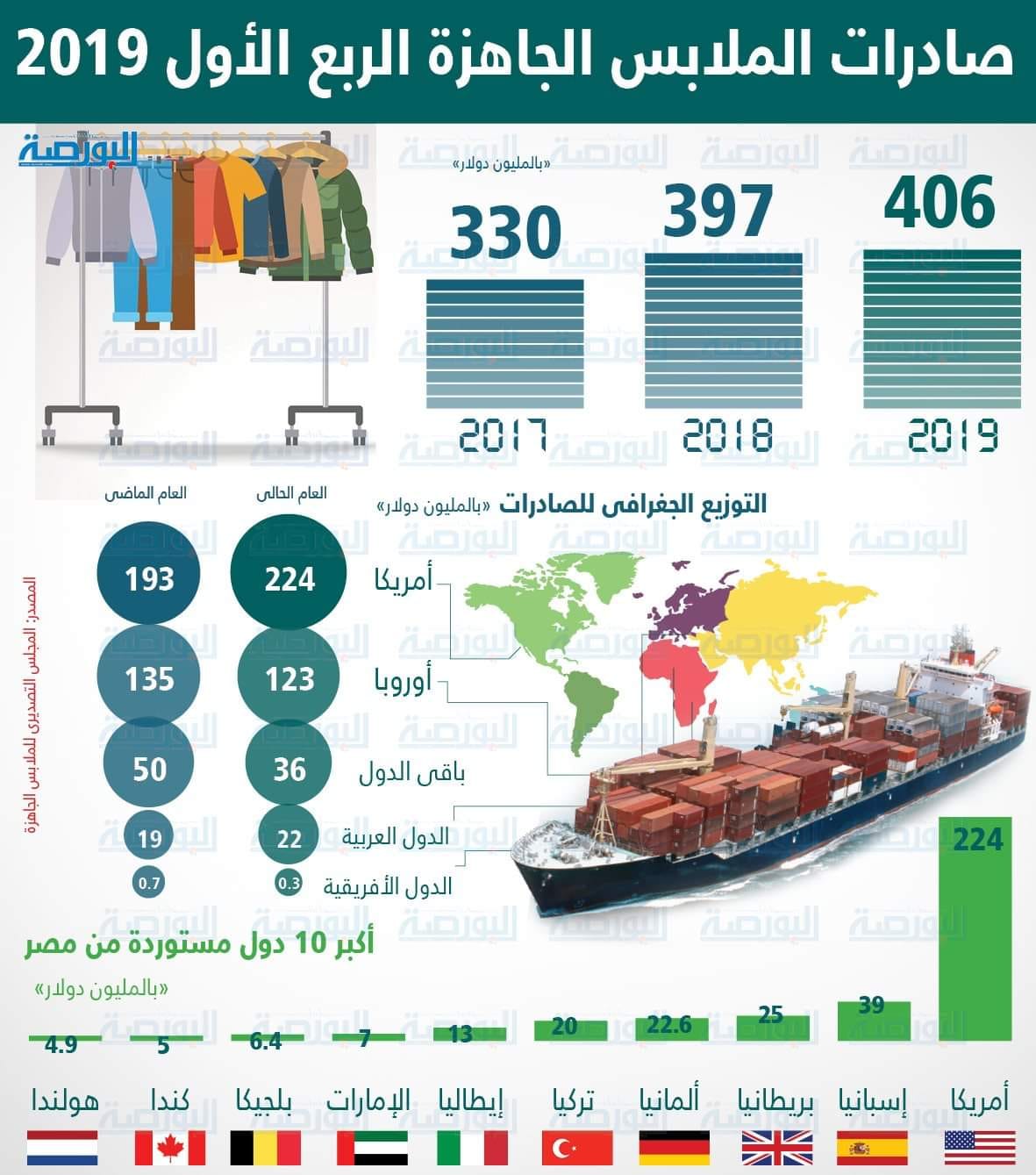 إنفوجراف يوضح صادرات الملابس الجاهزة خلال الربع الأول من العام الجارى 2019