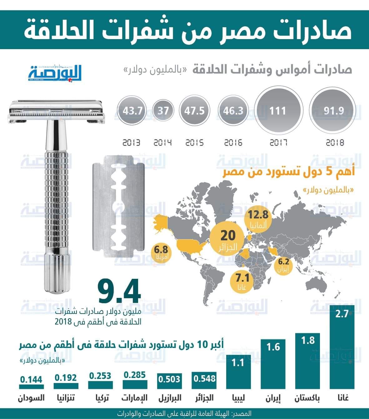<!-- wp:heading {"level":4} --> <h4>إنفوجراف يوضح صادرات شفرات الحلاقة من مصر <br>المصدر - الهيئة العامة للرقابة على الصادرات والواردات</h4> <!-- /wp:heading -->