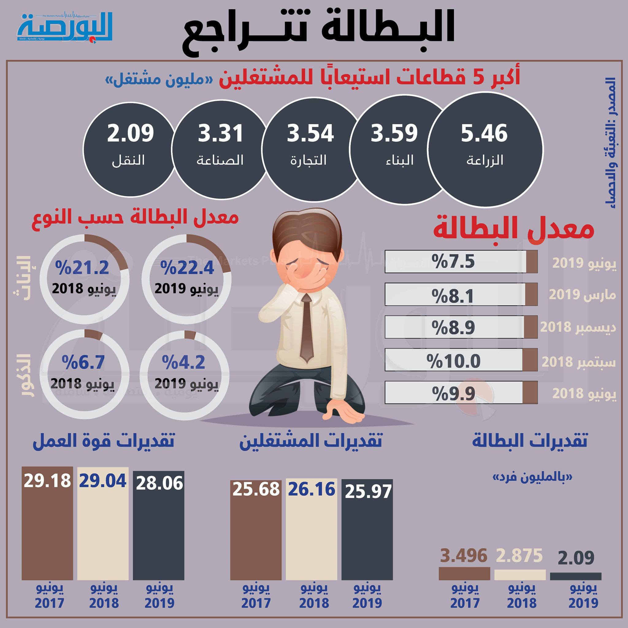 إنفوجراف يوضح تراجع البطالة وأكبر 5 قطاعات استيعاباً للمشتغلين