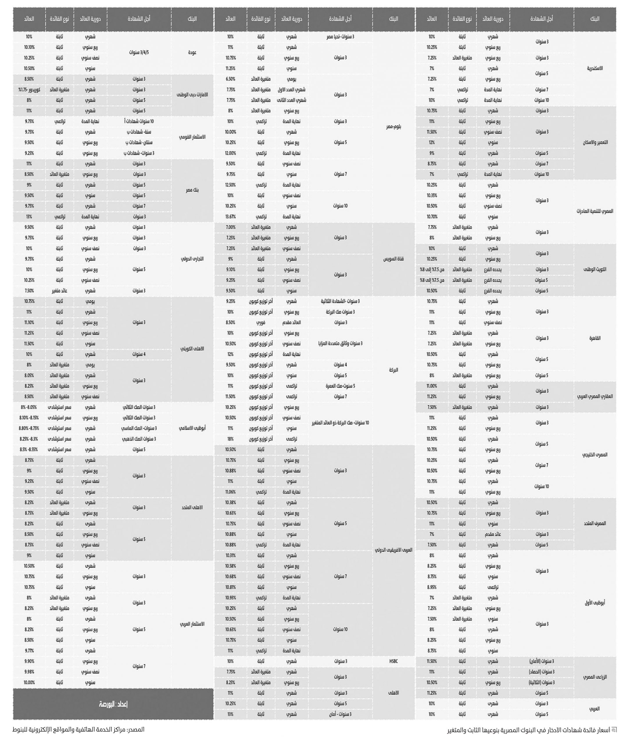 وكشف المسح عن نزول هوامش فائدة الشهادات متغيرة العائد لدى معظم البنوك إلى أقل من سعر الفائدة على الكوريدور، وسجل أعلى سعر للفائدة على الشهادات المتغيرة لدى الأهلى الكويتى -مصر بمعدل %8.75 وتوزيع ربع سنوى.