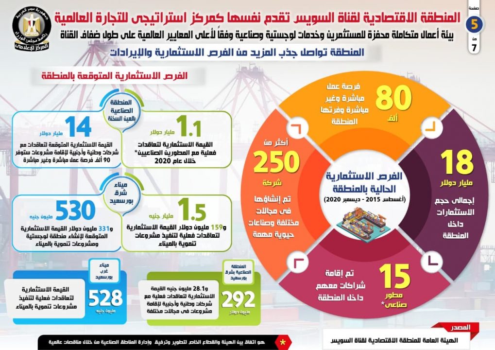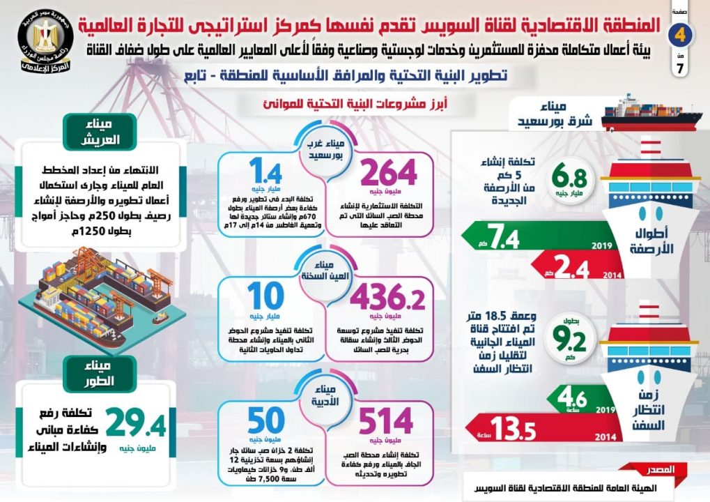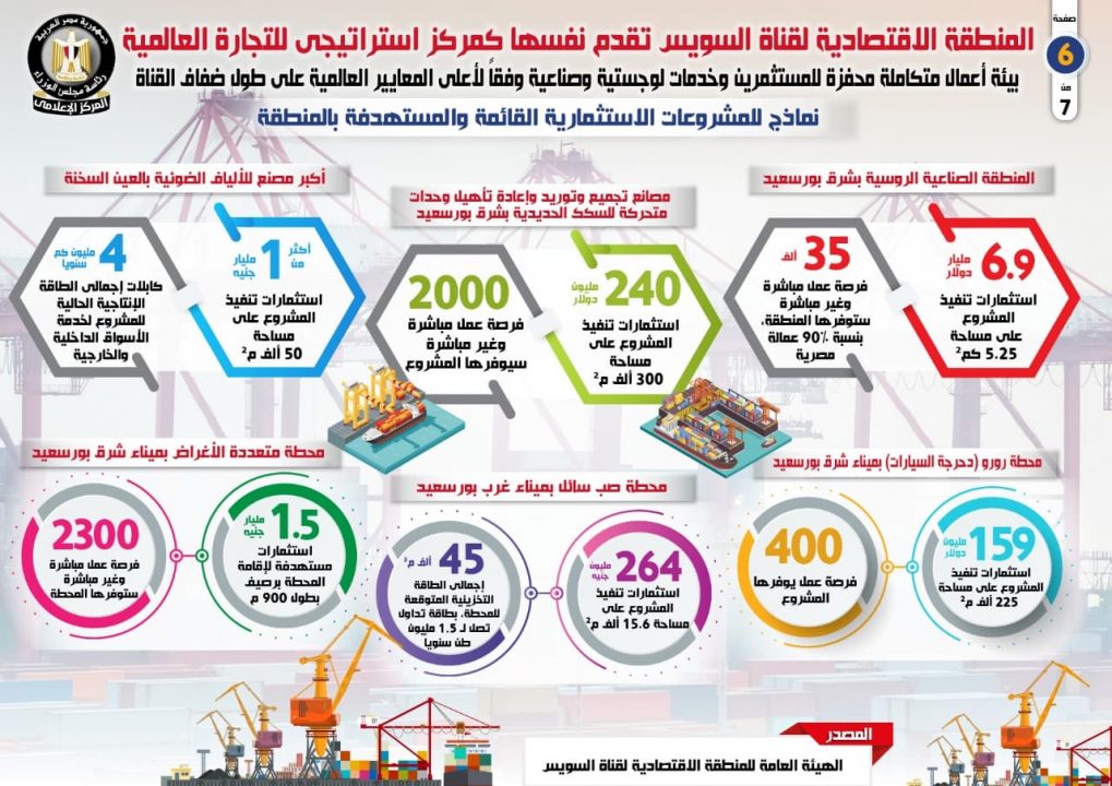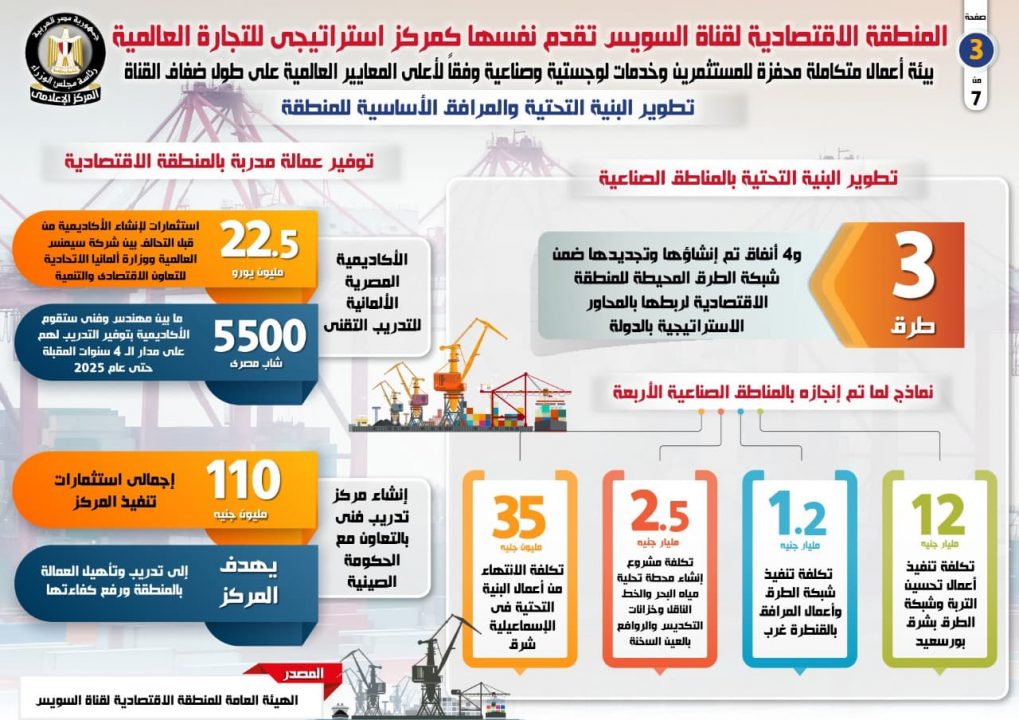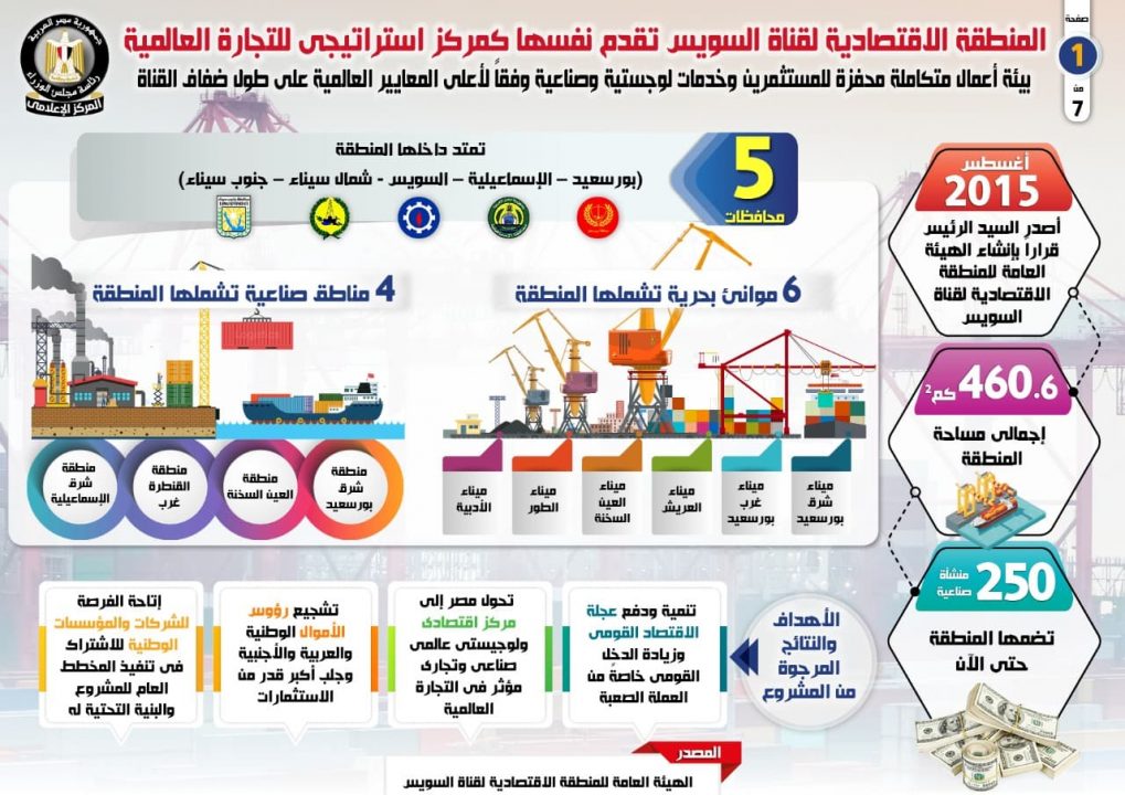 ونشر المركز الإعلامى لمجلس الوزراء، تقريراً تضمن إنفوجرافات تسلط الضوء على جهود تحويل المنطقة الاقتصادية لقناة السويس إلى مركز استراتيجى للتجارة العالمية.