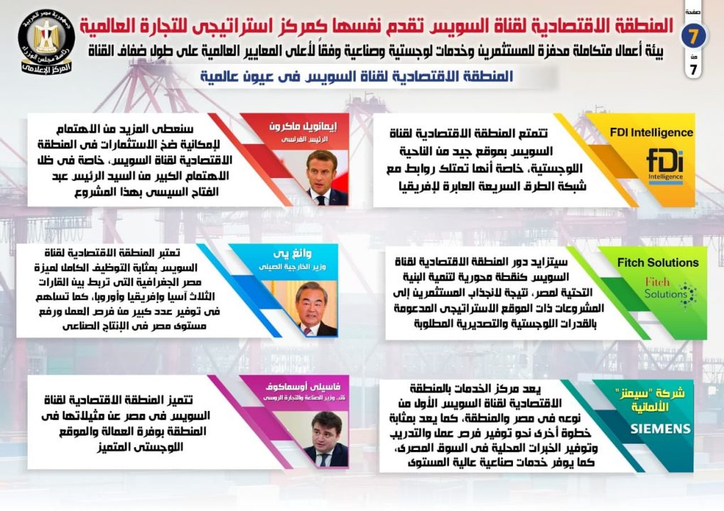 وصرح الرئيس الفرنسى إيمانويل ماكرون بأن فرنسا ستعطى المزيد من الاهتمام لضخ الاستثمارات فى المنطقة الاقتصادية لقناة السويس، خاصة فى ظل الاهتمام الكبير من الرئيس عبد الفتاح السيسى بهذا المشروع، بينما صرح فاسيلى أوسماكوف نائب وزير الصناعة والتجارة الروسى بأن المنطقة الاقتصادية لقناة السويس فى مصر تتميز عن مثيلاتها فى المنطقة بوفرة العمالة والموقع اللوجستى المتميز.